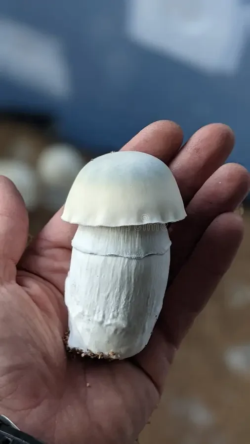 Produces thick, pale fruiting bodies with reduced pigmentation and dense stems. Noted for slow but steady colonization and stable sporulation despite its leucistic traits.